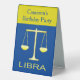 Ce magnifique panneau de tente de table d'anniversaire présente une image art numérique d'une paire d'écailles dorées de pesée avec le mot Libra sous le texte or. Un design amusant pour les gens célébrant un anniversaire né entre le 23 septembre et le 22 octobre sous le signe étoilé de Libra. Il y a du texte personnalisé à l'avant et à l'arrière pour que vous puissiez personnaliser ce panneau avec votre propre message.