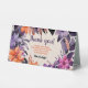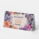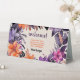 Bienvenue aux hôtes avec une touche de magie d'automne. Ce panneau de tente de table d'aquarelle présente une couronne de lys rose, orange et violet avec un feuillage doux sur un arrière - plan jaune pastel. Les champs de texte modifiables vous permettent d'afficher des salutations, des instructions ou des sièges, et l'emplacement de l'image vous permet d'ajouter le logo de votre petite entreprise. Une pièce polyvalente pour les événements d'entreprise, les pop-ups ou les occasions en relation avec le client, conçue pour se sentir à la fois professionnel et enchanté.
