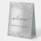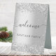 Un signe de bienvenue pour une fête. Un arrière - plan élégant à l'allure fausse argent décoré de confettis. Personnalisez et ajoutez votre nom. Lettres noires.
