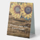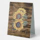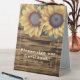 Personnalisez un panneau unique pour votre table de livre d'or avec un ensemble de panneau de tentes de Mariage de tournesol rustique. Le design des panneaux comporte un trio de tournesols aquarelles contre un arrière - plan rustique en bois. Papier à lettres mariage supplémentaire disponible avec cette conception aussi.