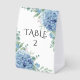 Tente de numéro de table magnifique avec des hydrangeas bleus sur fond blanc. Une belle façon de faire savoir à vos invités où ils sont assis à la réception. Les hydrangeas aquarelles sont juste magnifiques. Classique et chic.