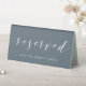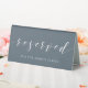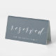 Panneau de table réservé mariage sur mesure avec calligraphie à main moderne avec texte personnalisé sur arrière - plan couleur acier bleu.