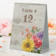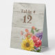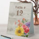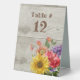 Panneau du numéro de la table mariage de style rustique réalisé dans un arrière - plan de clôture en bois clair, avec des graphiques vintages d'un bouquet de fleurs coloré. Personnalisez le texte de chaque table à votre réception.