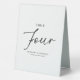 signe de tente de numéro de table mariage avec un arrière - plan blanc simple qui peut être changé en n'importe quelle couleur, le numéro de table "quatre" dans une police de script élégante, les noms de couples, et la date.