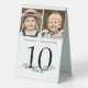 Panneau de tente avec 2 photos de la mariée et du marié au fil des ans pour divertir les invités. Numéro de table mariage personnalisé. Amusant d'avoir des photos d'âge similaires sur le même panneau et des photos différentes sur chaque table que les invités se mélangent. Imprimé sur les deux côtés pour un affichage recto verso. CHANGEMENTS : La couleur du texte noir peut être modifiée pour correspondre à votre jeu de couleurs et la verdure peut être supprimée si vous ne le souhaitez pas. CONSEIL PHOTO : Choisissez des photos avec le sujet au milieu et/ou pré-rognage dans une forme similaire AVANT de télécharger et d'utiliser l'outil CROP pour ajuster l'image dans la zone modèle. ASSISTANCE : Pour obtenir de l'aide sur la modification ou la personnalisation de la conception, le changement de couleur, le redimensionnement ou le transfert de la conception à un autre produit, contactez le concepteur AVANT DE COMMANDER via l'onglet MESSAGE Conversation Zazzle ci-dessous ou envoyez un courriel à makeitaboutyoustore@gmail.com.