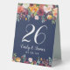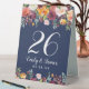 Les cartes de numéro de table de mariage de style romantique rustique présentent un monogramme élégant avec des chiffres encadrés par une aquarelle fleurie avec de beaux roses, dahlias, des fleurs de pivoines et de la verdure, dans une magnifique palette automnale de rouge bordeaux, jaune doré, orange pêche, rose roux et tons verts. Bleu marine riche couleur arrière - plan.
