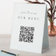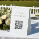 Faites en sorte qu'il soit facile à vos invités de mariage ou d'événement de voir vos sélections de menu avec ce panneau de table de code QR. "Analyser pour voir notre menu" apparaît en haut. Entrez l'URL de votre menu et le code QR sera mis à jour. Les clients peuvent scanner le code avec leur téléphone pour voir les sélections de menu.
