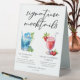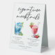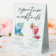 Cette signature chic de plage moque les panneaux de tente de table avec typographie noire simple au-dessus de 2 boissons balnéaires et leurs ingrédients pour votre fête côtière. Un délicieux lever de soleil hawaïen bleu et un dessin de fraise Daiquiri non alcoolisé ajoutent une touche cool à votre menu du bar. Complétez avec les noms du couple et la date de leur réception.