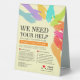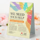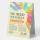 Nous avons besoin de votre aide pour bénévolat travail de charité publicité minimaliste table signe de la tente avec des mains colorées, les coeurs rouges, doux jaune arrière - plan et la typographie professionnelle. Customisez à votre goût.