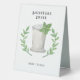Ce panneau de table présente une boisson mint julep dans une tasse en cuivre avec un blason de feuille de laurier entourant la boisson.