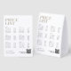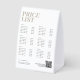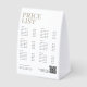 A modern business price list paper table tent sign design showcasing your business QR code, business website and social media handle as well as price lists. A minimalist personalized QR code, social media business table tent sign. A simple and professional way to allow your customers to scan, pay, view menus, price lists, make appointments etc. Customize the text and make it your own..