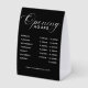 This table tent sign features a sleek black background with modern, easy-to-read typography. The high-contrast design ensures clear visibility on counters, desks, and tables.