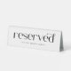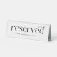 Ce panneau de tente réservé simple et moderne est parfait pour s'installer aux tables de réception de mariage, chaises ou bancs. Il dispose d'une police serif moderne pour un look propre et élégant. Vous pouvez modifier la ligne pour indiquer à qui le siège est réservé ou le supprimer si vous le souhaitez. Il est en noir et blanc. Mariage simple, moderne et élégant réservé panneaux de tente de table.