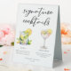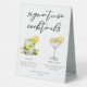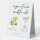 Cet été signature cocktails panneau de tente de table comprend une simple typographie noire au-dessus de 2 de vos boissons préférées et leurs ingrédients pour votre bar mariage côtier. Un dessin chic Mojito and Lemon Drop Martini ajoute une touche amusante à votre menu du bar. Complétez avec les noms du couple et la date de leur réception.
