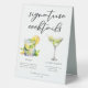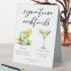Cet été signature cocktails panneau de tente de table comprend une simple typographie noire au-dessus de 2 de vos boissons préférées et leurs ingrédients pour votre bar mariage côtier. Un dessin chic Mojito et Martini ajoute une touche ludique à votre menu de bar. Complétez avec les noms du couple et la date de leur réception.