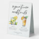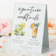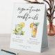 Cet été signature cocktails panneau de tente de table comprend une simple typographie noire au-dessus de 2 de vos boissons préférées et leurs ingrédients pour votre bar mariage côtier. Un dessin chic de Mojito et Piña Colada ajoute une touche amusante à votre menu de bar. Complétez avec les noms du couple et la date de leur réception.