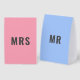 Play a fun game of Mr or Mrs? with these pastel pink and blue game table tents! Endless fun for wedding parties, bridal showers, engagement parties, bachelorette, bachelor parties or a fun way to get the in-laws to know you better! Ask a friend to write some embarrassing stories, silly secrets and everyday facts about the couple and have the guests figure out if its the Mr or Mrs! At your wedding reception, you can include a tent at each place setting or pass them out to your guests when you’re ready to play. To start the game, sit with your spouse in the center of the dance floor, back to back, each with a tent in hand. Designate a DJ or loved one to MC the game. The rules are simple. The MC will call out questions about the newlyweds. You and your guests will then answer using the fan paddles. If everyone thinks you’re more likely to lose your keys, they’ll hold up Mr or Mrs. If your partner is the perceived better dancer, your guests will flip the fan. Everyone will roll in laughter when you both disagree on who is messier! Here are some question ideas: Who is the better cook?, Who was cooler in high school?, Who is more likely to be late to work?, Who is more creative?, Who wants more kids?, Who snores most?, Who is most likely to get a speeding ticket? or Who has the crazier family? Make it even more special by including questions specific to the couple. The possibilities are endless!