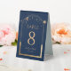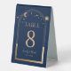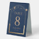 Mystical Chic Bleu Or Soleil Lune Étoiles Mariage Numéros de table Tente de tableau Le panneau présente un cadre de soleil, lune et étoiles d'or sur un arrière - plan bleu marine foncé. À l'intérieur, il y a vos informations de numéro de table personnalisées. Conçu pour vous par Evco Studio www.zazzle.com/store/evcostudio