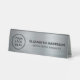 Panneau de nom de table de bureau moderne avec le logo de votre entreprise ou de votre organisation contre un arrière - plan métallique en argent faux brossé. Ajoutez un nom et un titre dans une simple typographie.