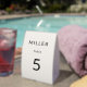 Ce panneau de numéro de table de mariage architectural présente un titre de nom de famille gras et une mise en page minimaliste structurée, conçu comme une pièce de réception modulaire à double usage.