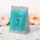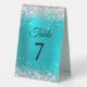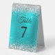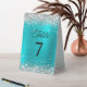 Créez votre propre modèle de texte de numéro de table de mariage vertical de 4" x 6" à l'arrière et à l'avant du panneau de tente de table. L'arrière - plan de l'art numérique présente une parties scintillant en faux argent ceinturé avec un graphisme art numérique bleu bleu bleu aqua turquoise. Veuillez noter que vous devrez customiser chaque signe de numéro de table dont vous avez besoin individuellement, en les ajoutant chacun à votre panier un par un.