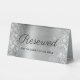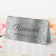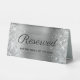 Créez votre propre place réservée mariage table signe de tente pour la fête de la mariée, la famille de la mariée, ou la famille du marié. Le design présente une parties scintillant en argent brillant et faux girly sur les bords latéraux sur un arrière - plan en feuille de dégradé gris argenté foncé et faux art numérique. La couleur principale de la parties scintillant décorative effets numériques, dégradé graphique et élégante calligraphie sont gris, argent, noir et blanc. On peut customiser à la fois l'élégante calligraphie et la police moderne de caractères casquette.
