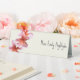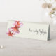 Des fleurs de plumeria rose tentes placent des cartes avec le nom modèle. Ecru, des panneaux en plastique se tiendront à chaque endroit. Ajoutez le nom de chaque invité en texte gris imprimé à côté de jolies fleurs tropicales roses.