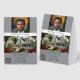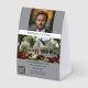 Real Estate broker, sales, realtor, table tent cards. Pretty advertisement card for your real estate company, business. Photo of a pretty, white home with red flowers and trees in the yard. This image can be used for your own cards, commercial use ok. Photo of a salesman should be changed to your own.