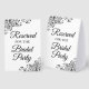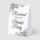 Ce simple panneau de table permettra à vos invités mariages de savoir quels espaces sont réservés à la fête de la mariée. Le design simple en noir et blanc présente un élégant lettrage avec des boucles décoratives et des tourbillons dans les coins.