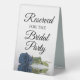Ce simple panneau de table permettra à vos invités mariages de savoir quels espaces sont réservés à la fête de la mariée. Le design intemporel classique est orné d'élégantes lettres de script et d'une seule rose de couleur bleu ou gris-bleu en acier à long tige, posée sur son côté, mise en miroir dans un bassin d'eau.