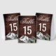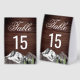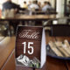 Elegant rustic wedding table number featuring beautiful snow capped mountains and pine trees with modern typography against a barn wood background.