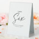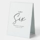 signe de tente de numéro de table mariage avec un arrière - plan blanc simple qui peut être changé en n'importe quelle couleur, le numéro de table "six" dans une police de script élégante, les noms de couples, et la date.