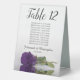Ces panneaux de numéro de table de tente ne sont pas seulement beaux, ils incluent même une liste de noms pour les invités à chaque table, ce qui permet à vos invités de trouver facilement leur siège à votre réception de mariage. Le design est à la fois élégant et romantique avec un seul rose de couleur violet royal allongé sur son côté réfléchissant dans l'eau avec des vagues et des ondulations. Le titre est en calligraphie de script en dentelle avec des chiffres en gras afin que vos invités puissent facilement trouver la bonne table. Il y a de la place pour les noms du couple et la date du mariage.