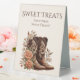 Améliorez votre décoration de réception de mariage avec ces gâteries Country Western Sweet signe de table. Cette enseigne magnifiquement conçue apportera une touche de charme champêtre à votre table douce avec des Bottes de Cowboy de luxe avec des fleurs. Explorez la collection pour un mariage à thème champêtre.