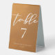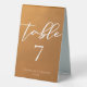 Ce numéro de table en or rustique mariage sur un panneau de table est orné d'une élégante typographie blanche superposée sur un dégradé de tons de terre sous-estimé. Les teintes simples orange pâle et marron suivent les tendances d'automne actuelles pour un mariage bohème cet automne. Complétez le look avec votre script minimaliste sur le fond de couleur.