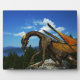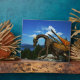 Un dragon est assis sur un gros rocher regardant une forêt de pins en direction d'un lac.