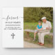Plaque de souvenir photo élégante en souvenir affectueux d'un membre de la famille très aimé. Le texte de souvenir indique "à jamais dans nos cœurs" et est écrit en écriture manuscrite et en typographie majuscule. Vous pouvez ajouter votre propre texte, tel que "En souvenir affectueux de..." et le modèle de photo est prêt pour que vous puissiez ajouter l'une de vos photos précieuses. Le design est complété par une croix, que vous pouvez supprimer si vous le souhaitez (cliquez sur "personnaliser davantage").