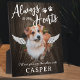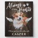 Plaque commémorative rustique pour animal de compagnie avec un fond en faux bois sombre, le titre 'à jamais dans nos cœurs', des empreintes de pattes, une photo de votre chien ou chat bien-aimé, des ailes d'ange, leur nom et la phrase de sympathie 'je vous verrai de l'autre côté'.