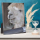 un alpaga blanc d'une ferme d'alpaga locale. les enfants et certains adultes s'amusaient à leur nourrir le foin.