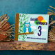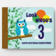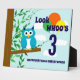 Regarde qui a un anniversaire ! Chouette bleue amusante dans une scène boisée avec ciel bleu et nuages moelleux