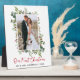 Moderne minimaliste Élégance Calligraphie encre stylo manuscrit Notre première plaque photo Mariage de Noël nouvellement mariée comprend Elégant Aquarelle verte, Eucalyptus Feuilles & baies Holly. Script rouge.
