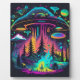 Une scène de camping OVNI néon dans le ciel nocturne.