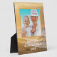 Plaque photo debout avec modèle de photo carré et texte en dessous. L'image de fond est une plage au lever du soleil. La photo est encadrée de jaune doré, avec un script blanc pour les noms, le lieu, l'événement, la date, etc. selon les besoins.