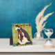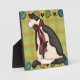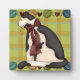Arrière - plan vert, bleu, plaid avec folk primitif, chat noir et blanc décoré de boules de fil et de coeur. Cadeaux décoratifs et utiles uniques pour elle. Illustration de la garniture de chats et de fils par Trina Clark. Conception de Deborah Miller.