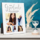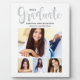 Simplement élégant panneau de graduation avec chevalet présente "2025 Graduate" dans un script de calligraphie gris argent tendance avec un collage photo moderne de quatre (4) portraits supérieurs de la grade.