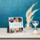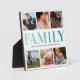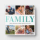 Plaque photo de famille modifiable avec un arrière - plan blanc chic qui peut être changée en n'importe quelle couleur, 6 photos carrés, le mot "FAMILLE" dans une police de dégradé turquoise design, plus le vôtre, vos partenaires et les noms d'enfants.