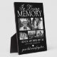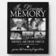 Plaque commémorative familiale personnalisée avec un arrière - plan noir élégant qui peut être changé à n'importe quelle couleur, 5 photos de votre être cher perdu, le texte "dans la mémoire aimante", leur nom, date de naissance/mort, un coeur blanc, et le souvenir disant "parti mais jamais oublié".