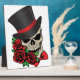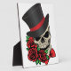 Le crâne est vêtu de son chapeau supérieur et de sa cravate arc rouge avec de belles roses rouges.