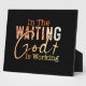 La plaque de tablette représente un simple script blanc et or sur un arrière - plan noir. Il comporte une croix et une citation chrétienne inspirante, "Dans l'attente, Dieu travaille."
