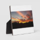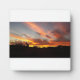 Beau coucher de soleil dans le désert avec une silhouette de plantes et de maisons.
